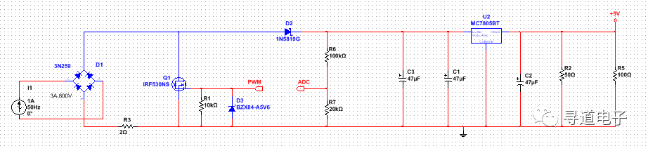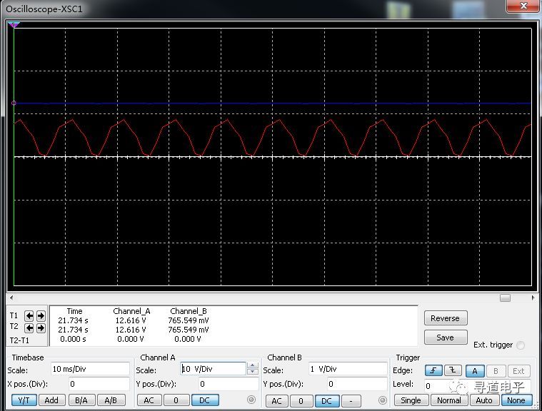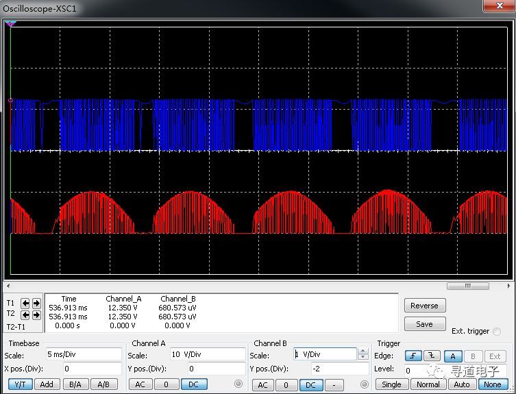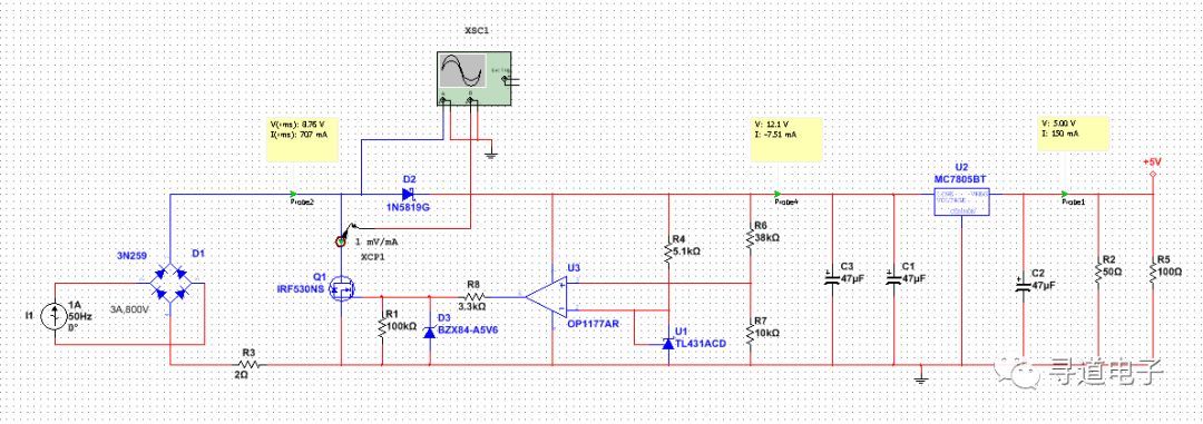 本方案采用一个并联式电压基准TL431和运算放大器OP1177来控制MOSFET开关管进行直流崭波,如果直流母线上的电压偏高,运算放大器打开Q1泄放电流;如果直流母线上的电压偏低,运算放大器关闭Q1,直流母线上的电流对电容C3和C1充电,直流母线上的电压随之上升。 这个电路启动速度非常快,只要直流母线上的电压上升到2.5V左右就可以正常工作,消除了方案二在启动过程中可能存在较高电压应力的风险;MOSFET开关管Q1工作在开关状态,消除了方案一中线性调整管存在较高热应力的风险。开关管Q1上的电压电流波形如图6所示,蓝色的曲线为电压波形,红色的曲线为电流波形,电流波形的包络线就是电流互感器经过整流桥后的波形。开关管Q1工作在开关状态,当Q1导通时,互感器二次侧电流全部经Q1返回,此时,直流母线上的电压为0V;当Q1断开时,互感器二次侧电流全部对直流母线上的电容充电,此时,流过Q1的电流为0A。