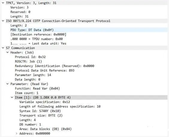 (5)读取数据发送报文: 由于只配置了VD0,因此读取DB1.DBX0.0 开始的4个字节 报文说明: TPKT(第五层:会话层) 该层总共占4个字节: 版本号:0x03 预留:0x00 长度:0x001F COTP(第六层:表示层) 该层总共占3个字节: 长度:0x02 PDU类型(DT Data):0XF0 目标引用:0x80 S7Communication(第七层:应用层) 该层总用占24个字节,并且分两部分: Header: 协议ID(Protocol ID):0x32 Ack_Data:0x01 预留:0x0000 协议数据单元引用:0x037D 参数长度:0x000E 数据长度:0x0000 Parameter: 功能码Read Var:0x04 通信项数:0x01 通信项1: 通信项Header 变量指定:0x12 地址长度:0x0A SyntaxID:0x10 传输数据类型byte:0x02 通信项Param 读取长度:0x04 DB号:0x01 存储区类型DB存储区:0x84 开始字节:0x000000