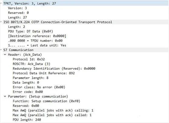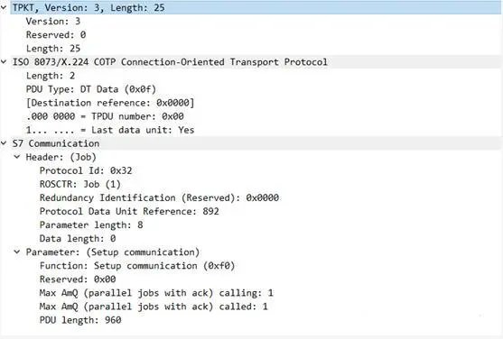 报文说明: TPKT(第五层:会话层) 该层总共占4个字节: 版本号:0x03 预留:0x00 长度:0x0019 COTP(第六层:表示层) 该层总共占3个字节: 长度:0x02 PDU类型(DT Data):0XF0 目标引用:0x80 S7Communication(第七层:应用层) 该层总用占20个字节,并且分两部分: Header: 协议ID(Protocol ID):0x32 Ack_Data:0x03 预留:0x0000 协议数据单元引用:0x037C 参数长度:0x0008 数据长度:0x0000 错误等级:0x00 错误代码:0x00 Parameter: 功能码:0xF0 预留:0x00 最大AmQ(Calling):0x0001 最大AmQ(Called):0x0001 PDU长度:0x00F0