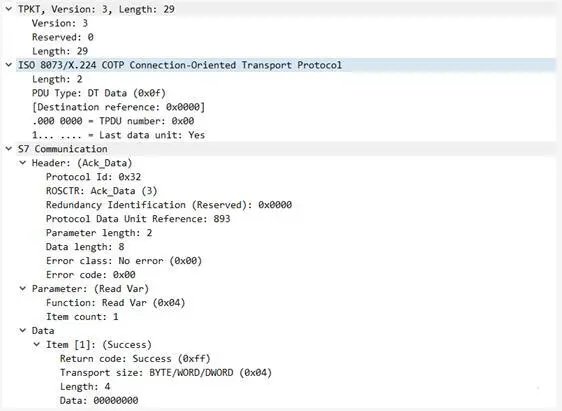该层总共占4个字节: 版本号:0x03 预留:0x00 长度:0x001D COTP(第六层:表示层) 该层总共占3个字节: 长度:0x02 PDU类型(DT Data):0XF0 目标引用:0x80 S7Communication(第七层:应用层) 该层总用占22个字节,并且分两部分: Header: 协议ID(Protocol ID):0x32 Ack_Data:0x03 预留:0x0000 协议数据单元引用:0x037D 参数长度:0x0002 数据长度:0x0008 错误等级:0x00 错误代码:0x00 Parameter: 功能码Read Var:0x04 通信项数:0x01 通信项1: 返回结果Success:0xFF 传输数据类型Byte/Word/DWord:0x04 长度:0x0020 数据:0x00000000