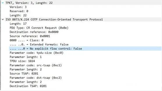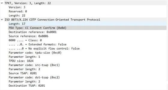 (2)第一次握手回复报文 报文说明: TPKT(第五层:会话层) 该层总共占4个字节: 版本号:0x03 预留:0x00 长度:0x0016 COTP(第六层:表示层) 该层总共占18个字节: 长度:0x11 PDU类型(CCConnect Confirm 连接确认):0x0D 目标引用:0x0001 源引用:0x0006 扩展格式/流控制:0x00 参数代码TPDU-Size:0xC0 参数长度:0x01 TPDU大小:0x0A 参数代码SRC-TASP:0xC1 参数长度:0x02 SourceTSAP:0x0201 参数代码DST-TASP:0xC2 参数长度:0x02 DestinationTSAP:0x0201