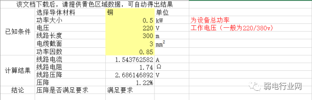 为了省去复杂的计算,因此,我们有个表格分享给大家,输入相应的参数据,可以自动计算出 电压降是多少,并且判断距离是否合理,非常方便,有需要的朋友可以下载下 (下载地址在下面)。