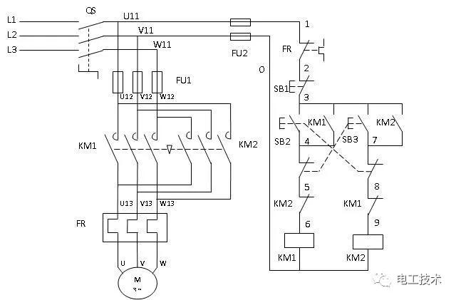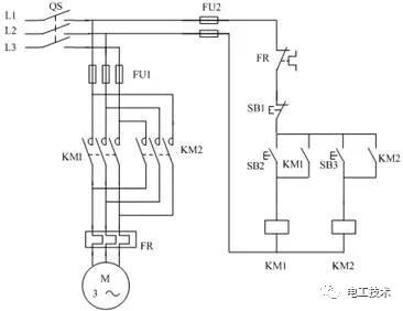 电机要实现正反转控制,将其电源的相序中任意两相对调即可(我们称为换相),通常是V相不变,将U相与W相对调,为了保证两个接触器动作时能够可靠调换电动机的相序,接线时应使接触器的上口接线保持一致,在接触器的下口调相。由于将两相相序对调,故须确保二个KM线圈不能同时得电,否则会发生严重的相间短路故障,因此必须采取联锁。