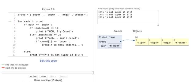 使用pythontutors执行代码 4. 使用字符串:这部分内容其实与字符串不完全相关,与挖掘Python优雅的库有更大关系。我们很早就在Python中学过,字符串也可以看作是一串字符。你也可以使用索引访问字符串中的字符。 word = 'supergreat'print (f'{word[0]}') >>> sprint (f'{word[0:5]}')>>> super敏锐的学习者会查看str()所提供的内容,但也可以不查看str()文档继续编程。查看函数或过程文档可以通过调用 help(str) 或者dir(str)来实现。执行此操作时,你可能会发现一些并不知道的方法,也许你在查看str()时,找到有个名叫 endswith() 的方法,或许能用在某处。