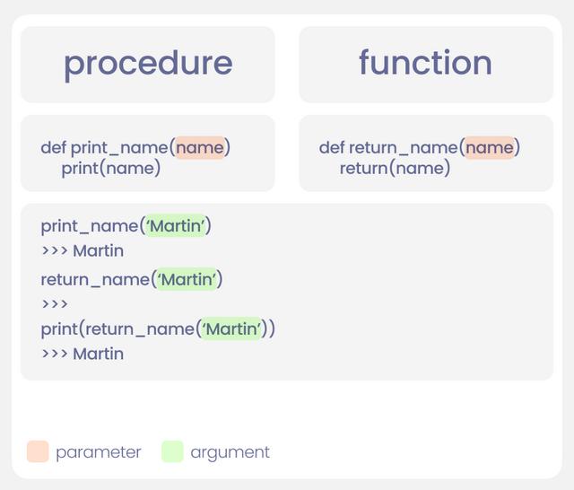 注意print和return的差异,看起来也许很相似,但如果你查看输出结果,函数只会返回发送的名称。 下一个要了解的语法是parameters和arguments,在过程或函数中定义时(红色部分)被称为形参(parameters),当发送名称到过程或函数中(绿色部分)时就叫实参(arguments)了。 下面是些案例: 案例1 def print_list(input_list): for each in input_list: print(f'{each}') print() #just to separate outputgreek_gods = ['Zeus' , 'Hera' , 'Poseidon' , 'Apollo' , 'Bob']grocery_list = ['Apples' , 'Milk' , 'Bread']print_list(greek_gods)print_list(grocery_list)print_list(['a' , 'b' , 'c'])