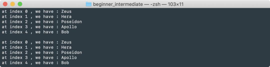 现在你可能明白了,实现同样的结果有很多方法,你必须找出适合你或你团队的那个。 额外知识点 •反向列表(或字符串): names = ['First' , 'Middle' , 'Last']print(names[::-1])>>> ['Last', 'Middle', 'First']•在列表中加入元素: names = ['First' , 'Middle' , 'Last']full_name = ' '.join(names)print(f'Full Name:\n{full_name}')>>> First Middle Last6. 使用循环:是否在Python中见过这样的代码? greek_gods = ['Zeus' , 'Hera' , 'Poseidon' , 'Apollo' , 'Bob']for index in range(0,len(greek_gods)): print (f'at index {index} , we have : {greek_gods[index]}')你可能发现了,它来自其他语言,这不是Python的风格。在Python中,你可以使用for-each循环: for name in greek_gods: print (f'Greek God: {name}')你很快就能发现,这里我们不包含索引。如果想用索引打印要怎么做?在Python中,你可以使用枚举(enumerate参数),这是一种访问所需内容的绝佳方案。 for index, name in enumerate(greek_gods): print (f'at index {index} , we have : {name}')