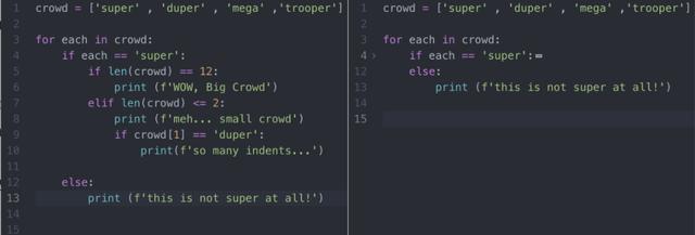 用户从一开始应该会索要扩展名,最后3个字母是Y问题,而X问题是我们想要扩展名。 def extract_ext(filename): return filename.split('.')[-1]print (extract_ext('photo_of_sasquatch.png'))print (extract_ext('photo_of_lochness.jpeg'))>>> png>>> jpeg3.理解代码为何起作用(或不起作用):作为新手,你可能要花几天来对付一小段代码。如果这段代码突然起作用了,你可能会感觉放心,然后继续下一段代码。这是最糟糕的事情之一。不理解原因只管运行的做法,可能比不理解代码的为什么不运行更加危险。 不理解为何代码不运行的情况总会发生,当进行故障排除并搞清楚其原因时,思考代码不运行的原因和最终使其运行的因素非常重要。这次学到的知识会带到下一个程序中。 例如,如果多个缩进级别的代码中出现了缩进错误,可以尝试随机调整代码块,然后在最终运行时为自己庆祝。 切记,在大多数IDE中,可以折叠循环和if语句,从而更容易查看正在使用的部分。