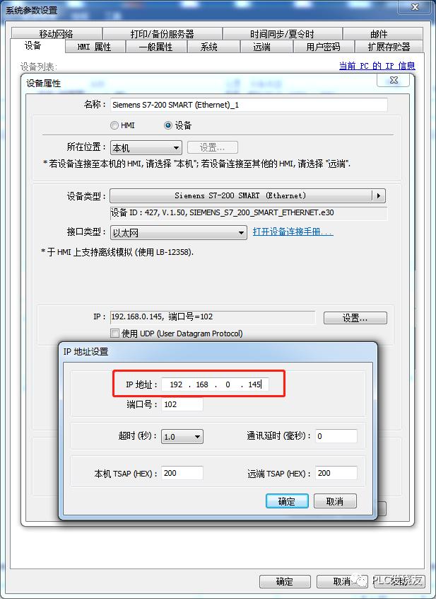 第六步:(设备名称选择200SMART Ethernet、接口类型选择以太网、IP地址设置成200SMART PLC下载通讯的IP地址即可)