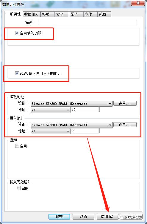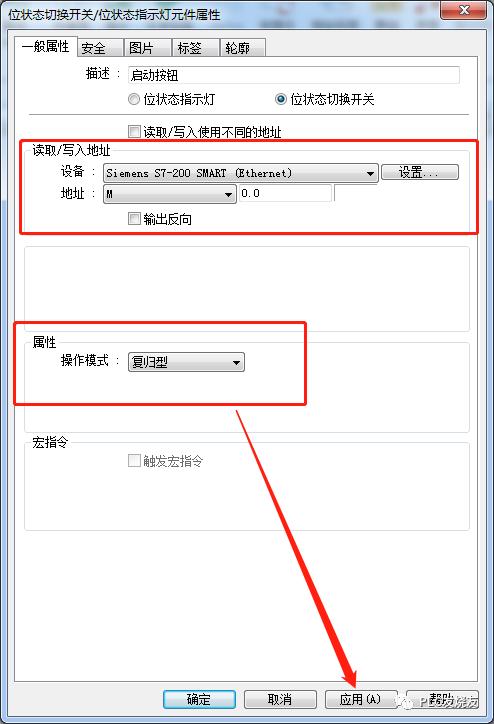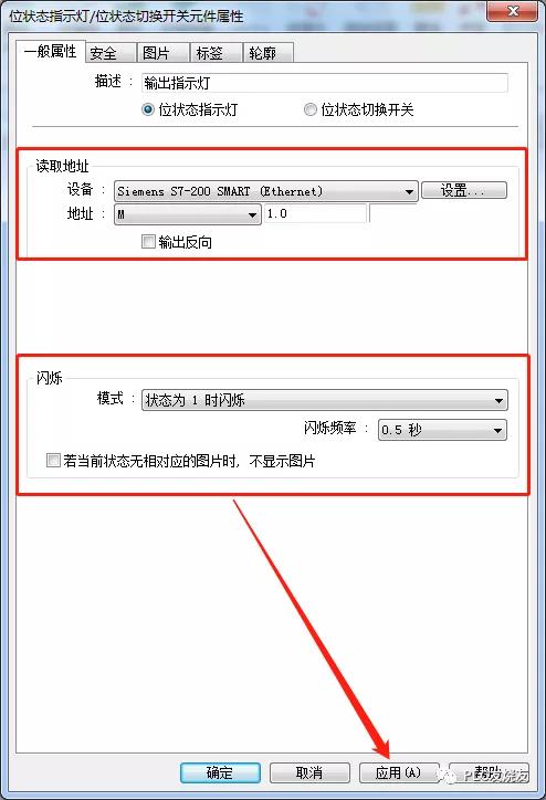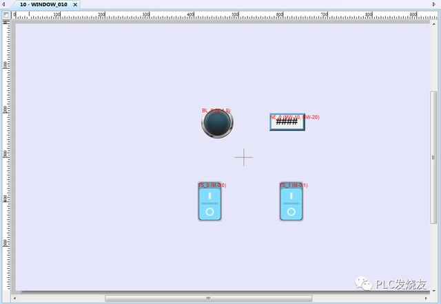 第七步:(在触摸屏组态两个按钮、一个指示灯、一个数显) 3. 指示灯关联PLC地址:M1.0 4. 数显关联PLC地址读取MW10、写入地址:MW20