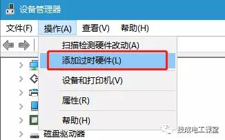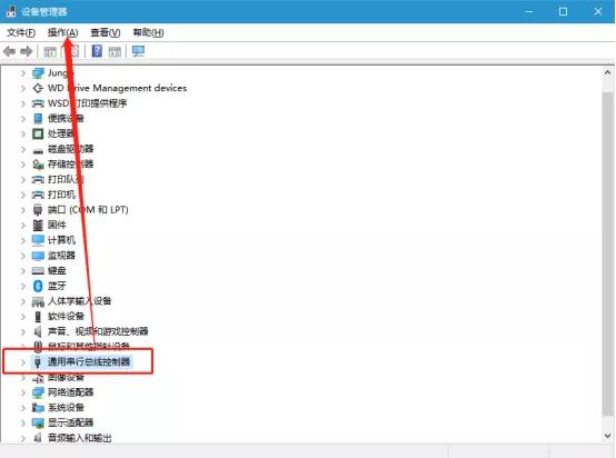 18、打开“设备管理器”后,选中“通用串行总线控制器”,点击“操作“添加过时硬件