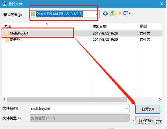 22、打开浏览,找到Patch EPLAN P8 (V1.8-V2.7)文件夹中的MultiKey64文件夹,选择组件multikey.inf,点击确定,点击下一步,再点击下一步,这样组件就安装完毕了