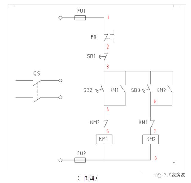 三.布置图上填号 将原理图四的号码填入图三所对应的器件上 如 KM1 常开点 3,4 号, 两个线圈的一端都是 0 号。 填号要注意常开 常闭不能弄错。由“填号定则” ①、②推得:元件两端号码的填入, 不论上下、右左、和先后秩序。 号码填好后形成下面的接线图: