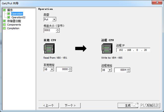 4. 远程CPU:远程IP:192.168.0.20,这里是(ST20)对方PLC通信IP地址,远程地址:VB4—VB5两个字节。