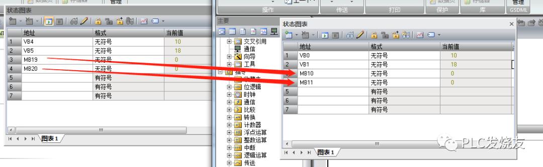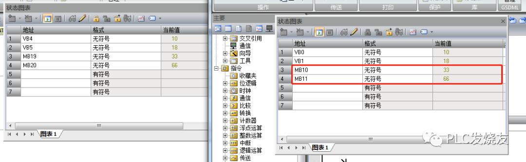 比如我现在在MB19里写入数值33,MB20写入数值66,此时可以观察到ST40状态图表MB10—MB11地址数值已成功写入。
