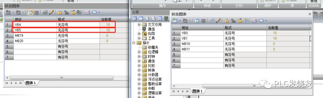 比如我现在在VB0里写入数值10,VB1写入数值18,此时可以观察到ST20状态图表VB4—VB5地址数值已成功写入。