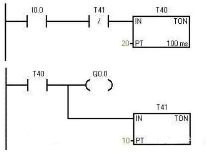 这个电路不管其他信号如何,I0.0一通电,它就开始工作,通断的时间值可以根据需要任意设定。图6b为 一个通2s、断1 s的闪烁电路控制梯形图。