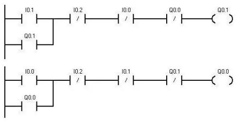 在图2(a)中,Q0.0和Q0.1通过输出进行互锁,一个得电,另一个必须在停止前一个的基础上才能启动,即只能是先停后启。