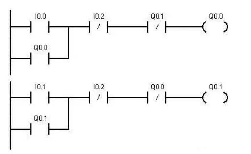 在如图2所示的互锁电路中,I0.0 I0.1是启动按钮,I0.2是停止按钮。