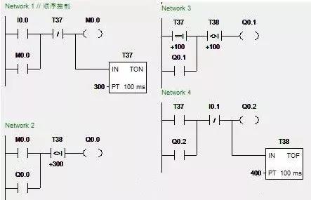 在图中,启动时,I0. 0为ON,用通电延时时间继电器T37通过比较指令来依次启动电动机,当T37的当前值等于100时,即定时10 s时,启动Q0.1,20 s时,启动Q0.2。停止时,I0.1为ON,用断电延时时间继电器T38通过比较指令来依次反向停止电动机。