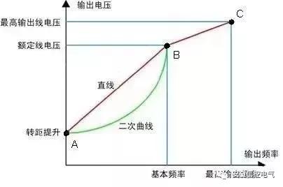 如下图,V/F符合直线AB,则是直线型;符合折线段ABC,则是多点型;符合曲线AB,则是平方型。
