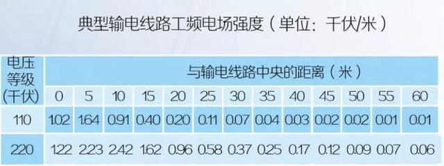 而我国《电磁环境控制限值》(GB8702-2014)以工频电场强度4千伏/米,工频磁感应强度100微特作为公众曝露的限值标准,较国际标准更为严格。输变电工程在环保的整个过程中都必须严格执行这个标准。 那么实际中我们已建成的高压线变电站的工频电场、工频磁场又是一个水平呢? 工频电场强度水平 高压线周边工频电场强度的大小主要取决于线路电压的高低、线路导线的排列方式、截面积、导线对地高度和观测点与导线的距离等。典型110千伏、220千伏输电线路的工频电场强度如下表所示。