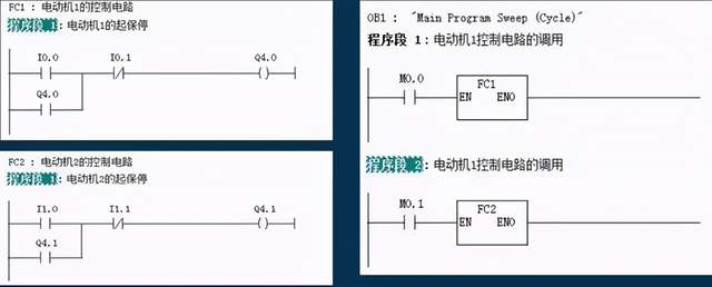 2.模块化编程实例2 有两台电动机,控制模式是相同的,按下启动按钮(电动机1为I0.0,电动机2为I1.0),电动机起动运行(电动机1为Q4.0,电动机2为Q4.1);按下停止按钮(电动机1为I0.1,电动机2为I1.1),电动机停止运行。 分析: 这是典型的起保停电路,采用模块化编程的思想,分别在FC1和FC2中编写电机的控制程序,在主程序OB1中进行FC1和FC2的调用。