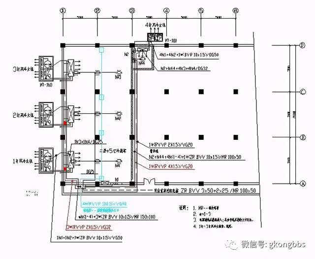 ■ 控制电路中的温控器电源开SA*,在自动时接通。 ■ 4#机组的控制回路接至L3,且无KA0。 ■ 电源信号颜色:L1—黄、L2—绿、L3—红。 ■ KM1和KM4设机械联锁,以策安全。 ■ *=1~4 3. 主机接线