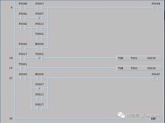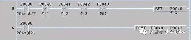 十一、PLC的优化设计 1.输入扩展电路的梯形图 用移位指令,以F0090的20ms扫描刷新P40~P43晶体管输出,给P001C~P0023送去取样电源,这样就得到了4x8=32点的输入信号扩展。梯形图如下: