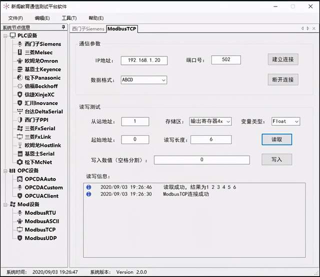 2、电脑B运行通信测试平台软件进行测试,采用ModbusTCP协议访问结果如下所示: