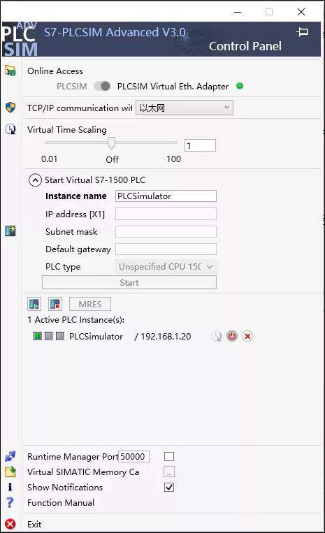 本篇文章采用第一个和第二个,就是搭建一个S7服务器及ModbusTCP服务器进行通信测试,搭建好仿真环境后之后,PLCSIM-Advanced运行如下:
