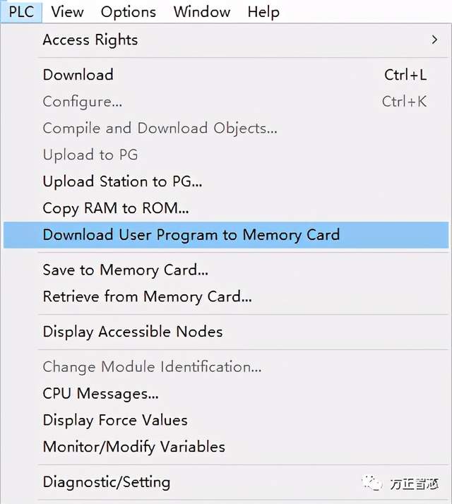 MC Flash卡是一种EPROM卡,具有掉电保持功能,可以用来扩展S7-400 CPU的装载存储器(Load Memory)。前面我们讲了MC RAM卡也是用来扩展装载存储器的,MC Flash和MC RAM卡的区别在于:MC RAM能和内置的装载存储器无缝连接,而MC Flash与内置的装载存储器是分开的。在STEP7中,点击【下载(Download)】只会将用户程序下载到内置的装载存储器中(或者MC RAM卡中),只有点击【下载用户程序到存储卡(Download User Program to Memory Card)】才会将程序下载到MC Flash卡中,如下图: