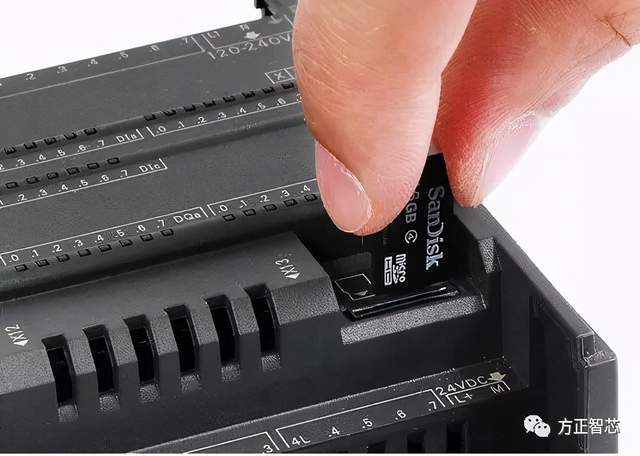 SMC卡为非易失性卡,具有掉电保持功能。除了作为装载存储器,还可用于程序的传输、固件升级、文档备份等功能。SMC卡的读取不需要专用工具,使用通用的SD卡读卡器即可,很方便。但请注意不能使用Windows下的格式化命令对其进行格式化,否则就会失去SIMATIC的特性,变成了一张真正的SD卡。要对SMC卡进行格式化,请在博途(TIA)环境下进行。 最后我们来谈下SIMATIC的新的小型PLC S7-200 Smart的存储卡。 S7-200 Smart集成有Micro-SD卡插槽,可以使用市面上通用的Micro-SD卡来进行程序传输或固件升级。如下图: