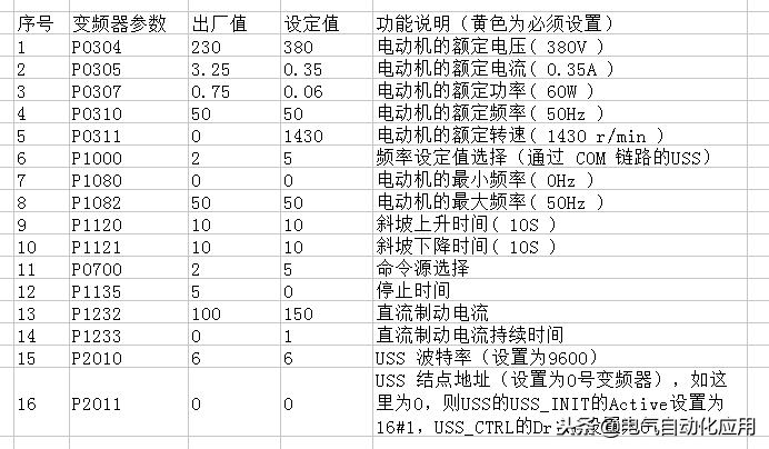 其中D0~D31代表有32台变频器,四台为一组,共分成八组。如果要激活某台变频器就使该位为1,现在激活18号变频器,即为表二所示。,构成16进位数得出Active即为0004000 若同时有32台变频器须激活,则Altive为16#FFFFFFFF,此外还有一条指令用到站点号,USS-CTRL中的Drive驱动站号不同于USS-INIT中的Active激活号,Active激活号指定哪几台变频器须要激活,而Drive驱动站号是指先激活后的哪台电机驱动,因此程序中可以有多个USS-CTRC指令。 1.2、USS_CTRL指令:被用于已在USS_INIT指令中ACTIVE(激活)的驱动器。且仅限为一台驱动器。 1.2.1、EN(使能):打开此端口,才能启用USS_CTRL指令。且该指令应当始终启用。 1.2.2、RUN(运行):表示驱动器是打开(1)还是关闭(0)。当RUN(运行)位打开时,驱动器收到一条命令,按指定的速度和方向开始运行。为了使驱动器运行,必须符合以下条件:DRIVE(驱动器)在USS_INIT中必须被选为ACTIVE(激活)。OFF2和OFF3必须被设为0。FAULT(故障)和INHIBIT(禁止)必须为0。当RUN(运行)关闭时,会向驱动器发出一条命令,将速度降低,直至电机停止。 1.2.3、OFF2:位被用于允许驱动器滑行至停止。 1.2.4、OFF3:位被用于命令驱动器迅速停止。 1.2.5、F_ACK :用于确认驱动器中的故障。当从0转为1时,驱动器清除故障。 1.2.6、DIR:表示驱动器应当移动的方向正转/反转。 1.2.7、Drive(驱动器):指定运行的驱动器号,必须已经在USS_INIT中被选为ACTIVE(激活)。 1.2.8、Type(类型—:选择驱动器类型,3系列或更早的为0,4系列为1。 1.2.9、Speed_SP(速度设定值):作为全速百分比的驱动器速度。Speed_SP的负值会使驱动器反向旋转方向。范围:-200.0%至200.0% 1.2.10、Resp_R(收到应答):确认从驱动器收到应答。对所有的激活驱动器进行轮询,查找最新驱动器状态信息。每次从驱动器收到应答时,Resp_R位均会打开,进行一次扫描,所有数值均被更新。 1.2.11、Error(错误):包含对驱动器最新通讯请求结果的错误字节。 1.2.12、Status(状态):驱动器返回的状态字原始数值。 1.2.13、Speed(速度):按全速百分比显示驱动器当前速度。范围:-200.0%至200.0%。 1.2.14、Run_EN(运行启用):表示驱动器是运行(1)还是停止(0)。 1.2.15、D_Dir:表示驱动器的旋转方向。 1.2.16、lnhibit(禁止):表示驱动器上的禁止位状态(0 - 不禁止,1 - 禁止)。欲清除禁止位,“故障”位必须关闭,RUN(运行)、OFF2和OFF3输入也必须关闭。 1.2.17、Fault(故障):表示故障位状态(0 - 无故障,1 - 故障)。 四、以下是变频器MM420的设置说明和步骤: (1)MICROMASTER4 可以有两种USS 通讯接口:RS232 和RS485。RS232 接口用选件模块(订货号为:6SE6400-1PC00-0AA0)实现。RS485 接口时,是将端子14 和15 分别连接到P+和N-来实现。 (2)为了进行USS 通讯,必须确定变频器采用的是RS485 接口,还是RS232 接口。据此可以确定USS参数应设定为哪个下标。 ①P0003 =2(访问第2 级的参数所必须的)。 ②P2010=USS 波特率。这一参数必须与主站采用的波特率相一致。USS 支持的最大波特率是57600 波特。(P2010的P2010[0](IN000)是设置COM链路的串行接口,P2010[1](IN001)是设置BOP链路的串行接口;一般我们用RS485的话是使用P2010[0](IN000)。) ③P2011=USS 结点地址。这是为变频器指定的唯一从站地址。(P2011的P2011[0](IN000)是设置COM链路的串行接口,P2011[1](IN001)是设置BOP链路的串行接口;一般我们用RS485的话是使用P2010[0](IN000)。 一旦设置了这些参数,就可以进行通讯了。主站可以对变频器的参数(PKW 区)进行读和写,也可以监测变频器的状态和实际的输出频率(PZD 区) ④P0700 =4 或5。这一设置允许通过USS 对变频器进行控制。“PZD 区”一节中,给出了对每一位含义的解释。常规的正向运行(RUN)和停车(OFF1)命令分别是047F(hex)和047E(hex)。其它的例子已在“PZD 区”一节中给出。 ⑤P1000 =4 或5。这一设置允许通过USS 发送主设定值。这是缺省情况下用P2000 进行的规格化,所以,4000(hex)=在P2000 中设定的数值。 为了对早期生产的变频器具有兼容性,也可以用P2009(访问级3)进行规格化。 以下是变频器设置步骤参数表: