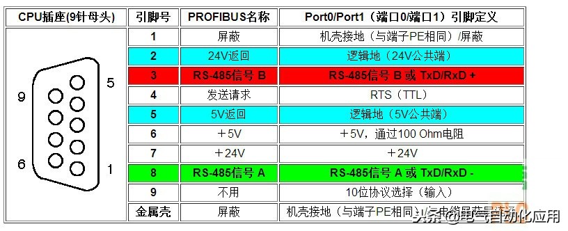 上表中,3和8为RS-485信号,它们的背景颜色与PROFIBUS电缆、PROFIBUS网络插头上的颜色标记一致。通信端口可以从2和7向外供24V直流电源。 需要注意的是: - CPU通信口上的2、5针在内部是连通的,并且它们和CPU上的传感器电源(+24V)的M也是连通的