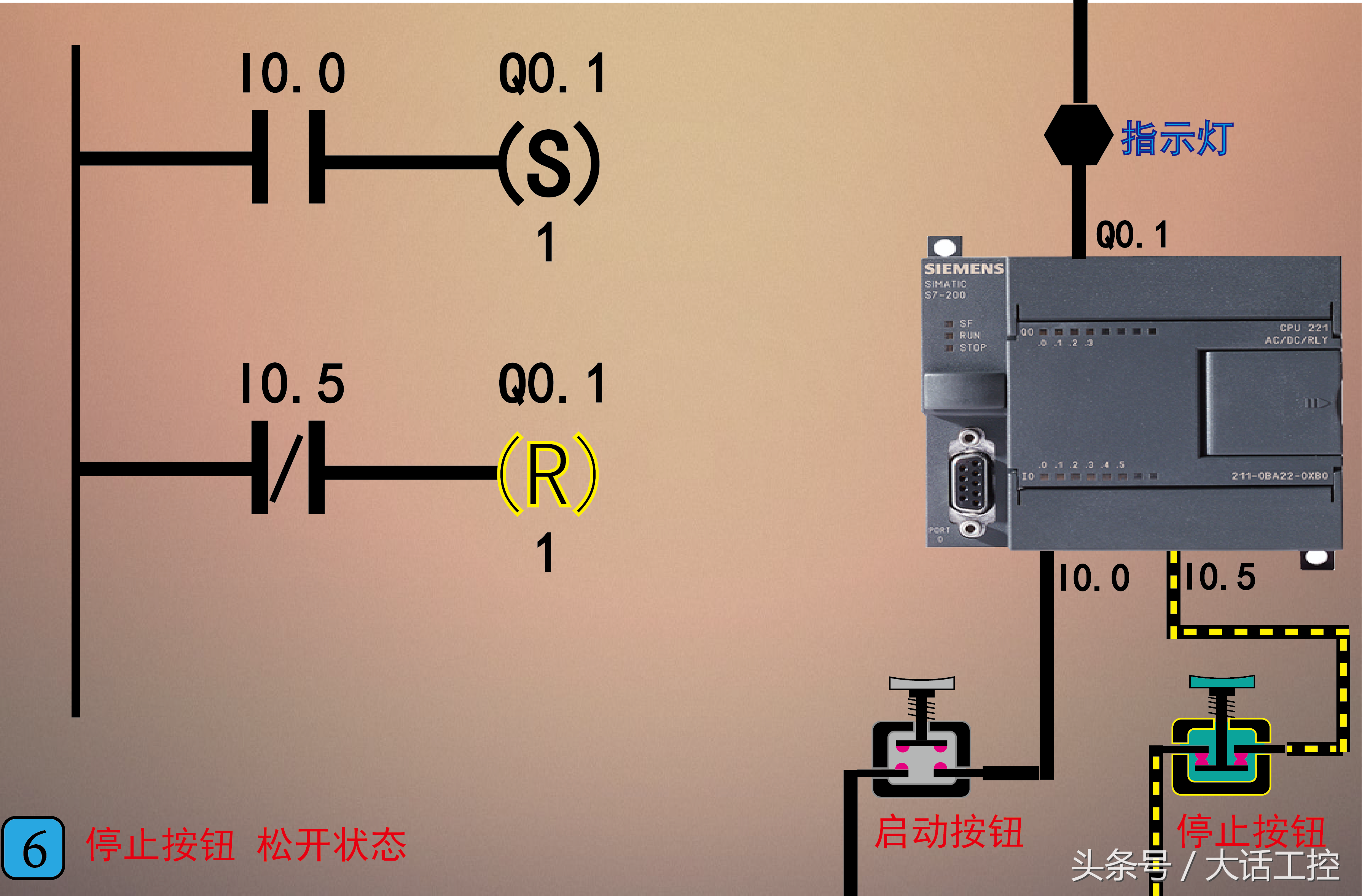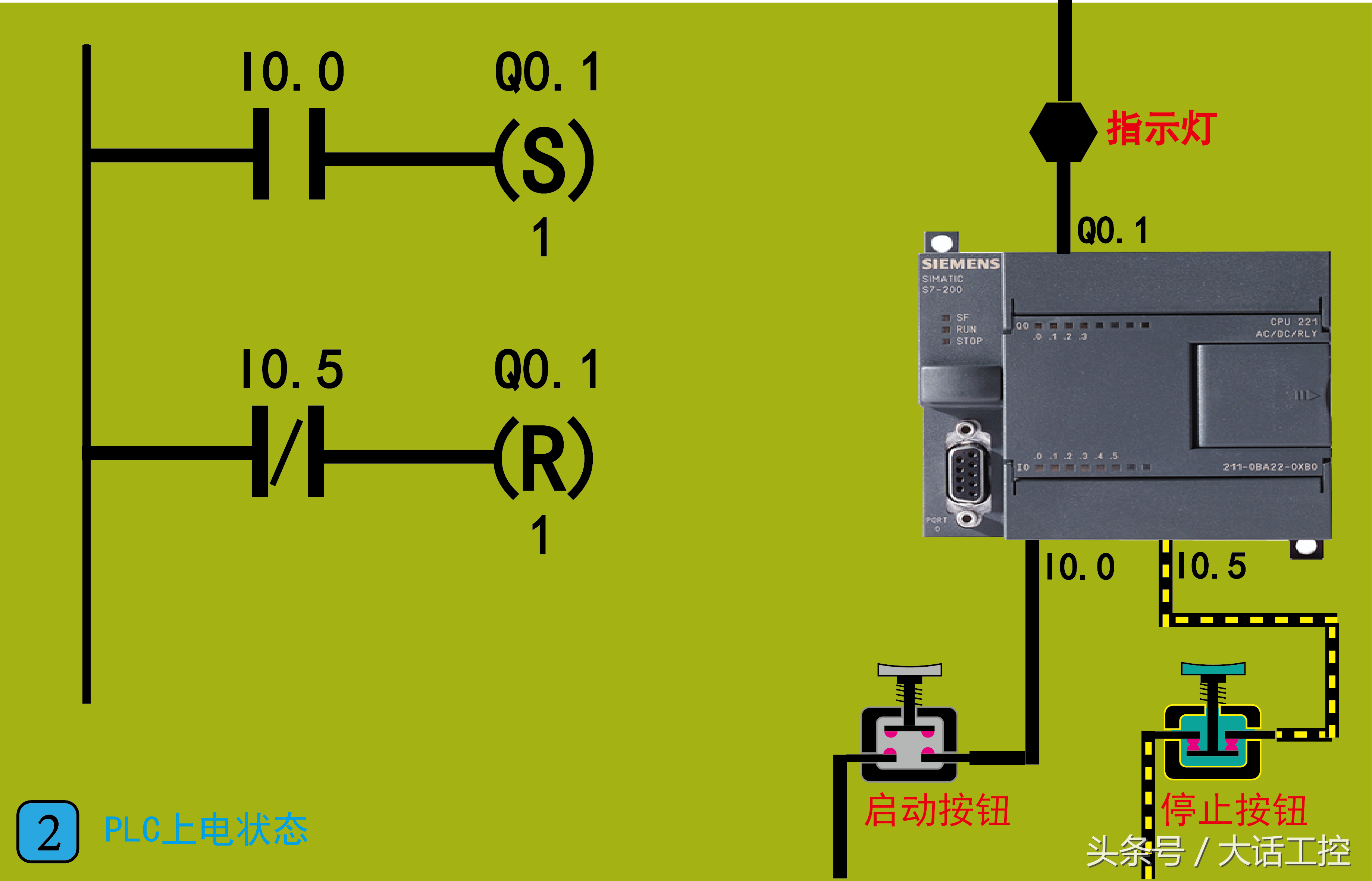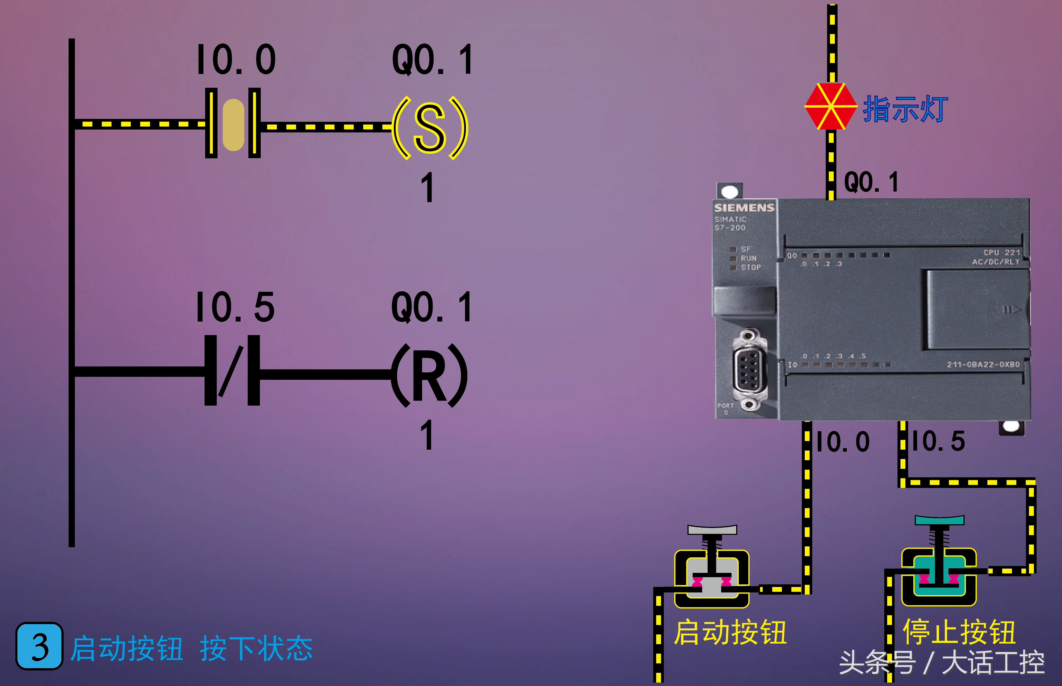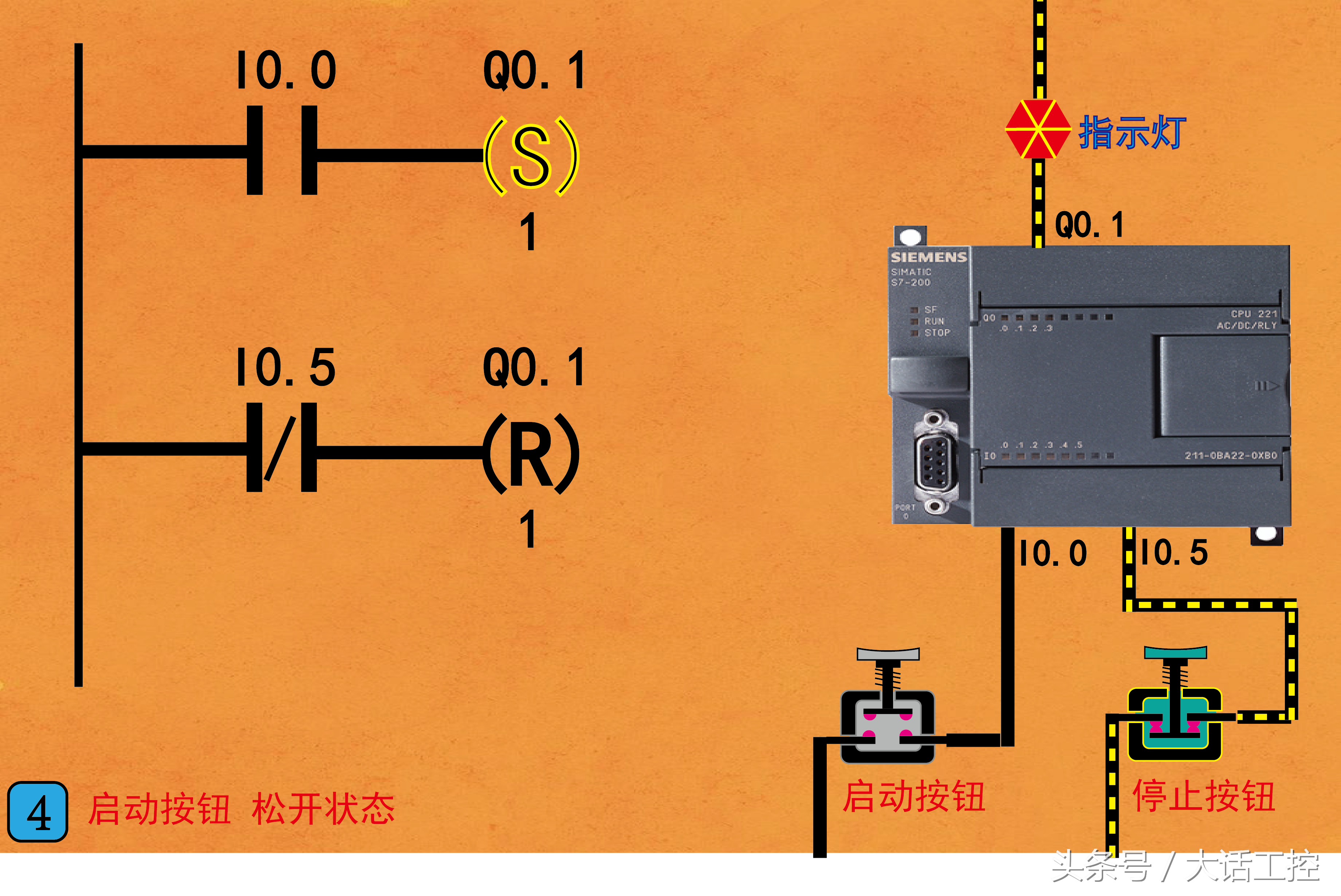 这一节讲一下西门子S7-200 PLC梯形图的置位和复位指令的使用方法,这两个指令的使用和原理没有大家想的那么复杂,其实非常简单。夸张一点说,你只要会开关你自己家里的照明灯,就能明白置位和复位指令的原理和使用方法。为什么这么说呢?这是因为: 1,置位指令相当于我们把照明灯的开关按到开的状态,即便我们把手离开,开关也是通的,灯也是亮的。想要关闭必须要把它按到关的状态,即使用复位指令。 2,复位指令相当于我们把照明灯的开关按到关的状态,把手离开,开关也是断的,灯也是不亮的。 想要打开必须要把它按到开的状态,即使用置位指令。 这就是置位和复位指令的工作原理,这样介绍是不是很容易理解了。下面看图1。 图1,是组成置位和复位指令的,每一部分的功能和作用。S指的是置位指令,R指的是复位指令。Q0.1指的是要对Q0.1这个控制点进行置位或复位。置位复位指令下面的1指的是,对1个控制点起作用,要是写成2,就是对Q0.1和Q0.2这2个控制点同时起作用,以此类推。下面通过一个实例对置位和复位指令使用进行演示讲解。 图2,是PLC上电以后的工作状态。左边是使用置位和复位指令写成的梯形图,右边是PLC的硬件接线图。要实现的功能是: 2,松开启动按钮(常开型),指示灯继续点亮。 4,松开停止按钮(常闭型),指示灯继续保持熄灭。 注意:因为PLC I0.5的外部接的停止按钮是常闭型的,所以PLC上电以后程序里的 I0.5是断开的。 接下来看图3。 图3,我们按下启动按钮(常开型),这时程序中I0.0就接通,执行置位指令,PLC中Q0.1被置位(相当于把开关按到开的状态),指示灯被点亮。 图4,松开启动按钮,这时程序中I0.0就断开,但Q0.1依然在置位状态(相当于开关依然在开的状态),则指示灯依然在点亮状态。实现了自锁的功能。只要我们不按下停止按钮,指示灯会一直亮下去。 图5,按下停止按钮(常闭型),这时程序中I0.5接通,执行复位指令,PLC中Q0.1被复位(相当于把开关按到关的状态),指示灯熄灭。这样就实现了停止的功能。 图6,松开停止按钮,程序中I0.5就断开,但Q0.1依然在复位状态(相当于开关依然在关的状态),指示灯继续保持在熄灭状态。 这就是西门子S7-200PLC使用置位和复位指令完成的一个启动,自锁,停止的程序的过程。相比于我们使用常开和常闭指令,程序更加简洁,逻辑步骤更少。大家注意,置位和复位指令在编程时,绝大多数情况是成对循环使用的,因为如果只使用置位或只使用复位,程序中的这个控制点就始终只会在一种状态。
