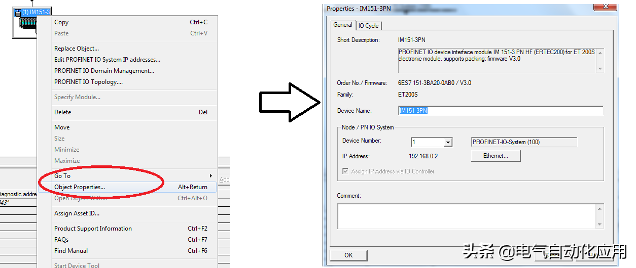 用鼠标双击(1)IM151-3图标,弹出该ET200S的属性界面。可以看到对于ET200S的简单描述,订货号,设备名称,设备号码和IP地址。其中Device Name设备名 称可以根据工艺的需要来自行修改,这里改为ET200S1。Device Number设备号码用于表示设备的个数。IP地址也可以根据需要来修改。这里使用默认状 态192.168.0.2。点击OK按钮,关闭该对话框。
