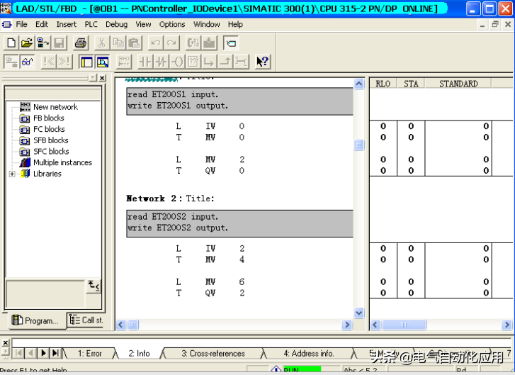 可以看见右侧栏内的OB1,双击OB1,进入LAD/STL/FBD的编程界面中。使用STL语言编程。根据在硬件组态中的ET200S两个站的DI,DO模板地址, 在Network1中,对ET200S1进行数据读写;在Network2中,对ET200S2进行数据读写。点击工具栏进行保存。
