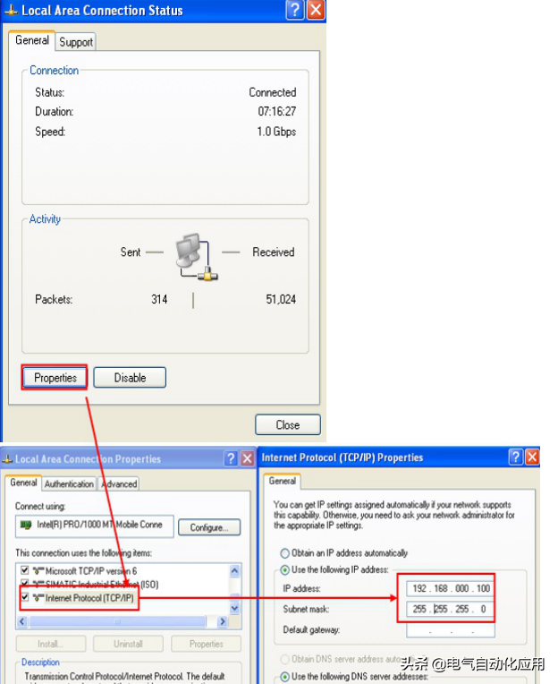 对本台PG/PC作为IOsupervisor,通过一根FC标准以太网线连接SCALANCEX206-1交换机。双击本地网络连接图标 ,给本机设置IP地址192.168.0.100。注 意要使各台PN设备要在同一个网段上192.168.0.0。