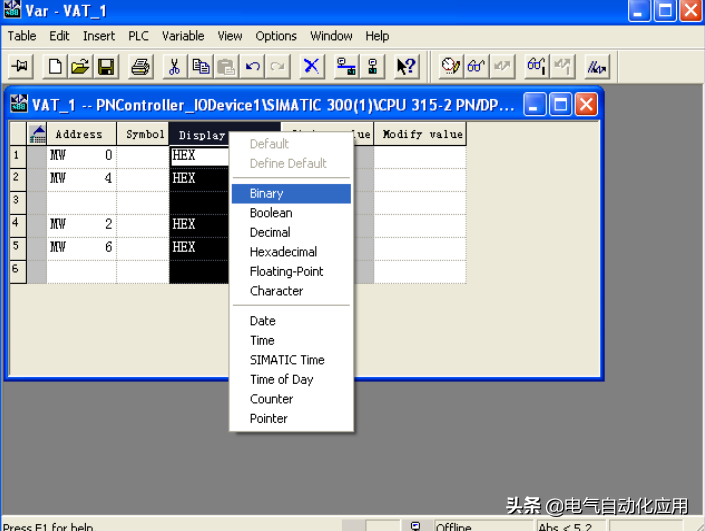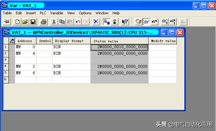 在SIMATIC Manager中出现名字为VAT_1的变量表。双击打开。 在Address栏中,添加所要观察的变量MW0,MW4;添加所要强制的变量MW2,MW6。用鼠标点击DisplayFormat栏,点击右键选择Binary方式显示。