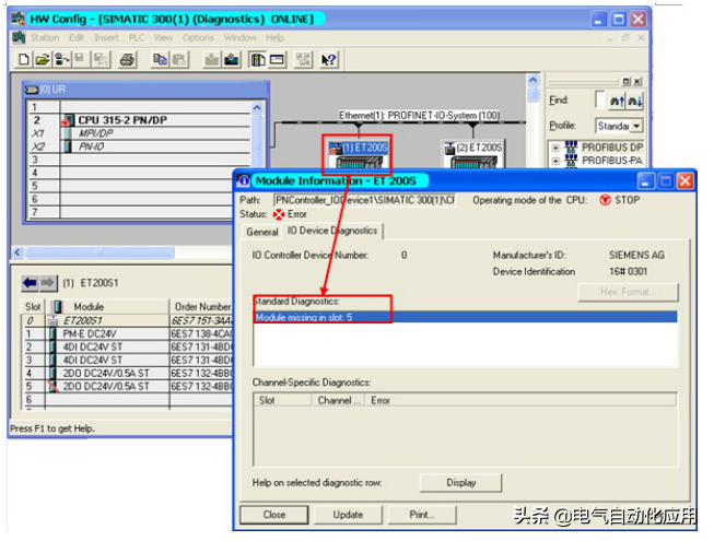 通过双击故障设备图标,查找故障信息。双击ET200S1图标。可以快速的查找故障原因。