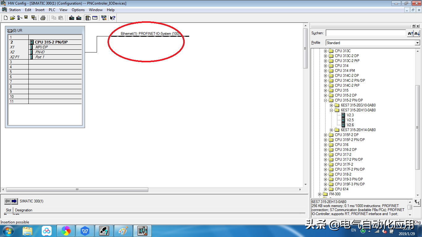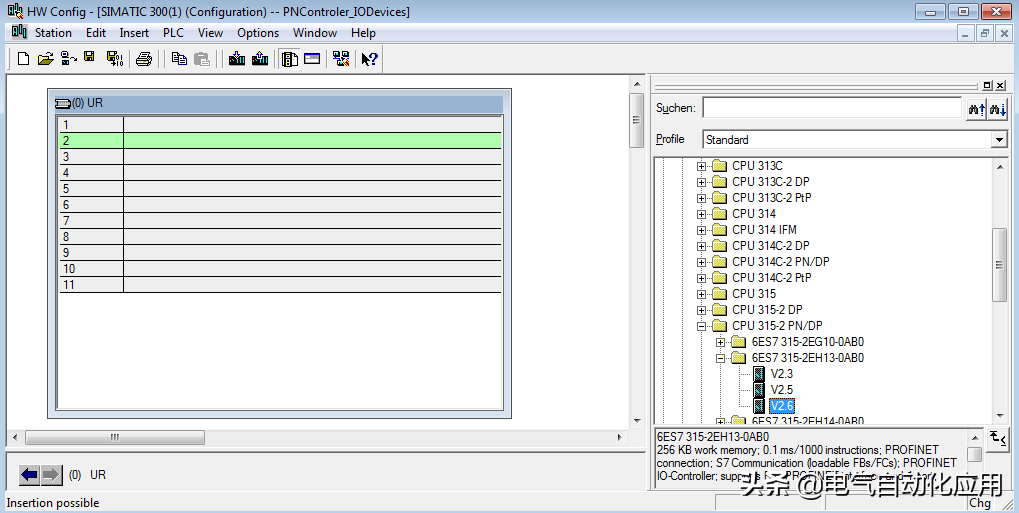 在这个机架中添加IO控制器的CPU模块,找到CPU-300的CPU315-2PN/DP的版本V2.6,使用鼠标托拽到机架的2号槽中。