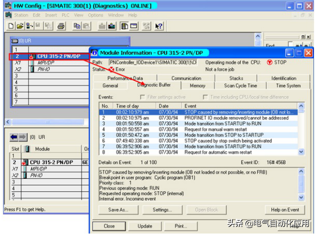 通过双击CPU315-2PN/DP图标,可以在Diagnostic Buffer中查找CPU停机的诊断信息。