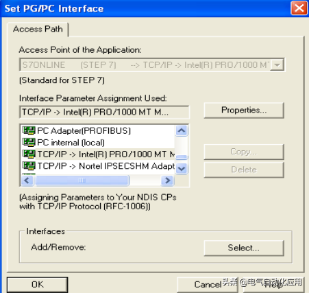 选择TCP/IP->Intel(R) PRO/1000MT...接口参数。其中Intel(R) PRO/1000MT...表示本台PG/PC的以太网卡。点击OK即可。