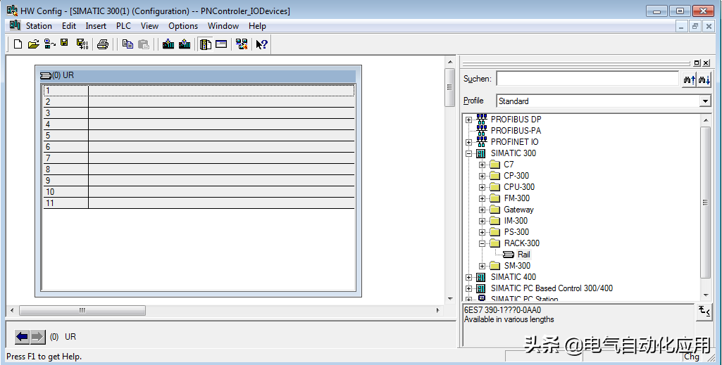 右侧栏内为产品分类,点击SIMATIC 300图标的+号。找到RACK300的机架Rail,用鼠标托拽到左上侧的空白栏内。