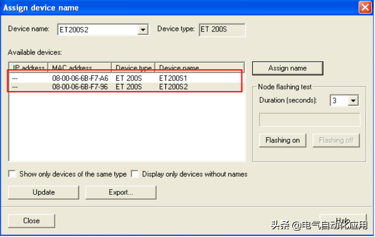 从图中看到两个ET200S站的一些信息。IP地址,由于没有下载PLC的硬件组态,故没有IP地址。MAC地址,是ET200S的PN接口模块在出厂时固化的硬件地址,不能修改。设备类型,此时指示在Ethernet(1)上的PNIO的类型均为ET200S。设备名,目前在ET200S的MMC卡中没有存储任何信息。通过下拉菜单 指示硬件组态的ET200S的设备名称为ET200S1,根据不同的MAC地址,通过鼠标选择不同ET200S设备。选择MAC地 址为08-00-06-6B-F7-A6的ET200S,通过“ASSIGN NAME”按钮,给其命名ET200S1