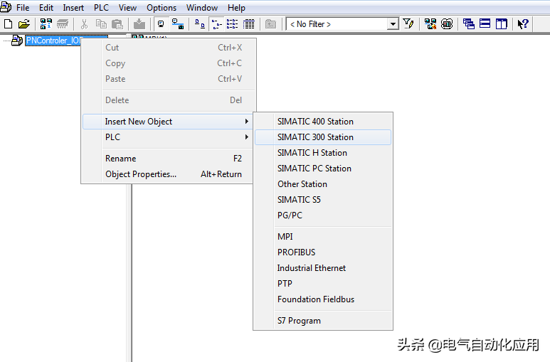 4.3 添加IOController 在SIMATIC Manager左侧栏内,右键点击 ,弹出菜单,插入一个S7-300站。