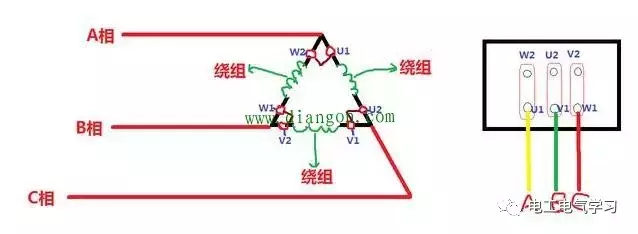 先不说别的,单单看上图黑线是不是很像一个三角形啊,所以叫三角形接法不是随便说的。对看过我昨天写的三相交流电的人来说这个图应该很容易理解。从图中也可以看出三相交流电机是有三个绕组的(绿色的部份表示绕组),每个绕组首尾各一条线,分别和另外一个绕组依次首尾相连,绕组的W2和另外一个绕组U1相连接组成A相,V2和W1相连接组成B相,U2和V1组成C相。从图中看就是把三个绕组串联起来,然后在每个相连的点引出作为三相电的三个相线也就是A相B相C相。