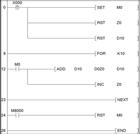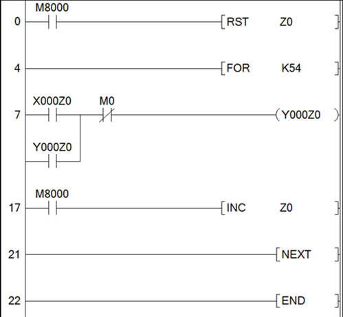 每次进行扫描都会先把Z0清0,然后进入循环(54次),第一遍Z0=0,这时X000Z0的地址是X000,Y000Z0的地址是Y000,X000触发Y000线圈并形成自锁,通过INC指令Z0自加1;第二遍,Z0等于1,这时X000Z0的地址是X001,Y000Z0的地址是Y001,X001触发Y001线圈并形成自锁,通过INC指令Z0自加1;… … 这样的话,就把本来很冗长的一大段简化成了一小段,节省程序步数的同时减少了编程的时间。 关于FOR指令,除了以上两种,大家平时还有什么用法?