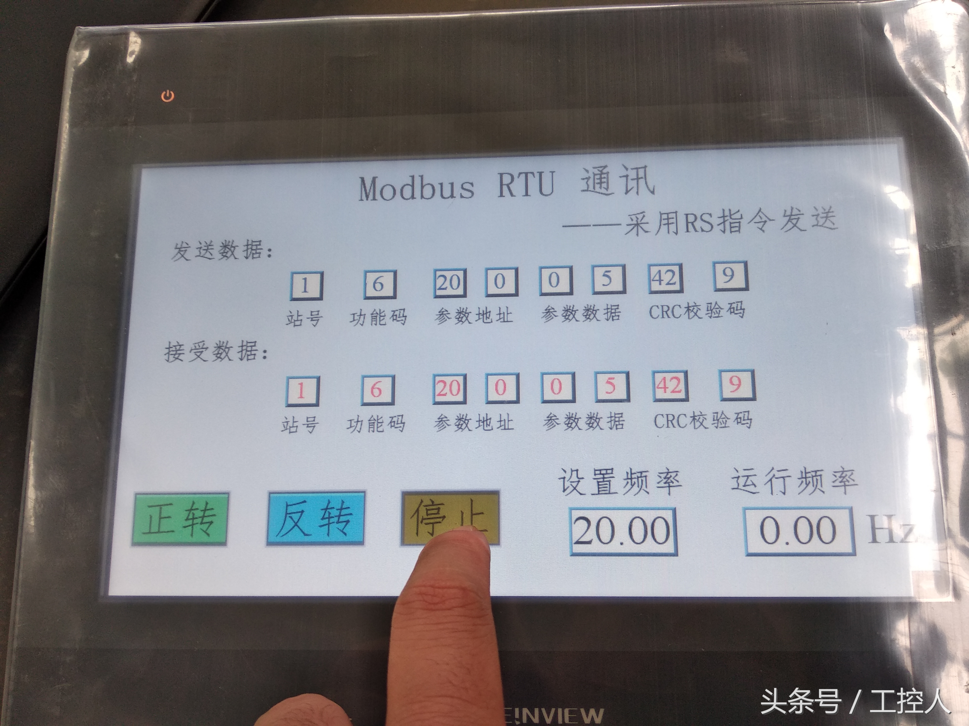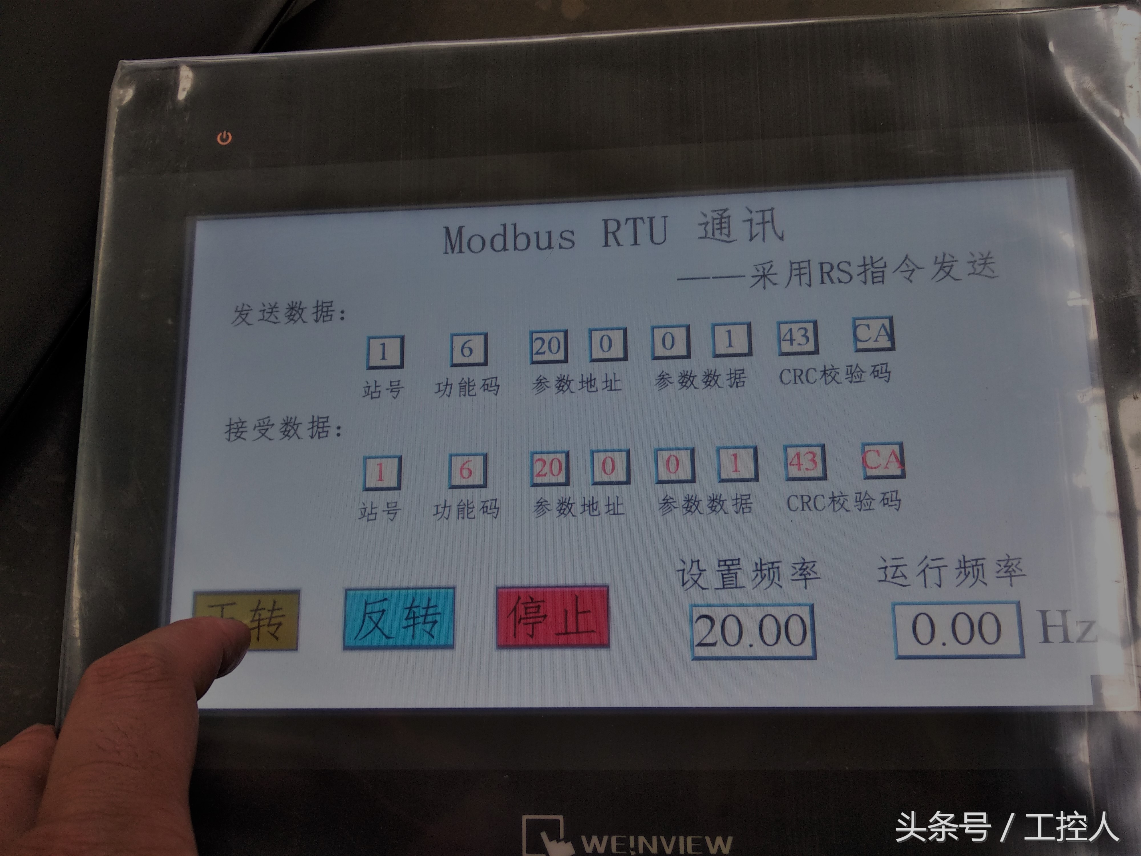 由变频器手册知道通讯控制的地址为2000H, 正转数据位0001H, 反转是0002H, 停机是0005H。