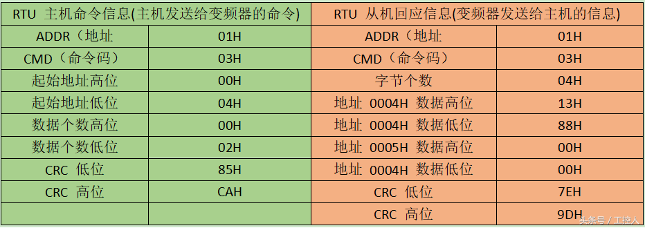 从上表看出主机向从机发送命令需要知道从机的地址、功能码(命令)、数据地址、数据个数、CRC校验码,以上例子中我们知道从机的地址是01H,功能码是读03H,地址是0004H,拆分成高低位,数据个数是俩个0002H,同样拆分,最后的CRC校验码是根据以上数据计算出来的,数据发送到从机后,从机也根据信息计算一个CRC校验码,如果与主机计算的校验码一致,则通讯成功,会向从机发送一组返回信号,我们就知道了从变频器中读取的信号,例如0004H和0005H地址的数据是5000,0, 那么返回信息除了地址与命令码不变, 后面的数据就变成了字节个数、 数据内容了,5000的16进制是1388H, 因此数据内容是高位13H, 低位88H。